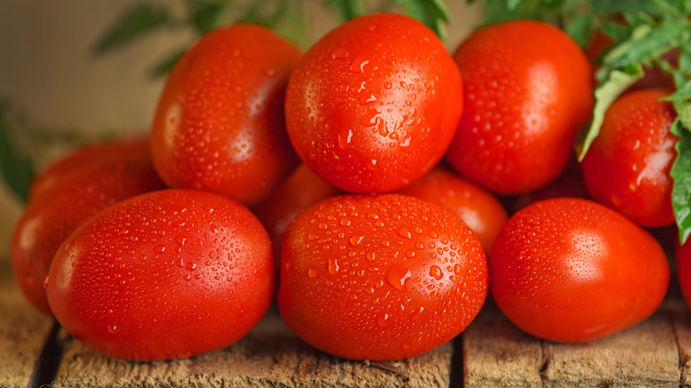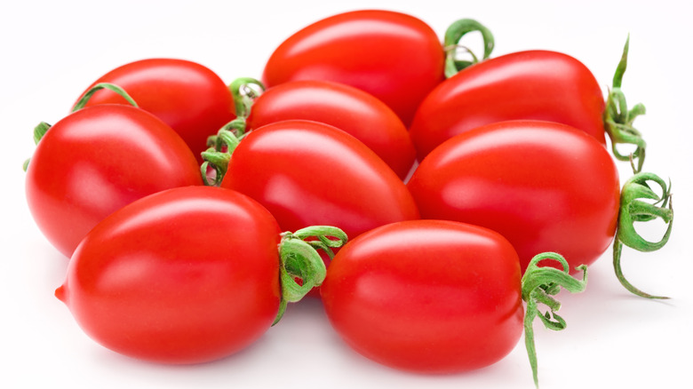 Roma tomatoes, like San Marzano tomatoes, are frequently grown for canning or for tomato puree. Specialty Produce describes Roma tomatoes as being meatier than they are juicy, which is why they fall under the plum tomato category. Roma tomatoes have a characteristically elongated shape, with high sugar and acid levels which make them more flavorful than slicing tomatoes (via Specialty Produce). This particular type of tomato is great for salsa, bruschetta, tomato soup, and sauces due to its lower moisture content.