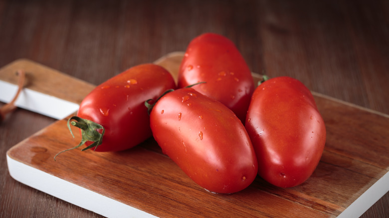 There is a wide variety of canned tomatoes available to us at the grocery store. Some are diced, others pureed, while whole peeled tomatoes remain a favorite among chefs and home cooks. Both San Marzano and Roma tomatoes are among the most common types used for canning. So what is the difference between these two tomatoes? Well, the first thing to recognize is their similar composition: Both have a higher flesh-to-juice ratio, which means that it contains a significantly smaller amount of that gelatinous and watery seed at the center. Thus, both are considered plum tomatoes, a type of tomato used to make sauces, per On the Gas.