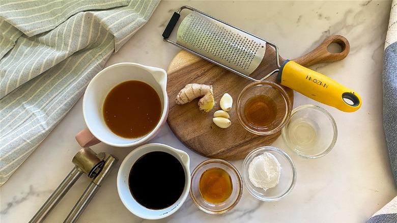 To make this recipe, you'll need a couple of items, including fresh ginger root, and garlic. In addition, pick up some broth (Hahn uses vegetable broth), honey, sesame oil, rice vinegar, and arrowroot powder. "You can swap out the honey for maple syrup or agave nectar, and if you can't find arrowroot powder, corn starch will work just as well," Hahn shares.