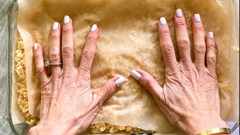 - Spread the mixture into the dish. Place a piece of parchment paper on top, and press down firmly to pack the mixture into the baking dish. Let it sit at room temperature for 30 minutes.