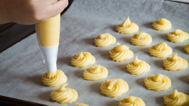 Pâte à choux, also known as choux pastry, is a common dough used to make elegant desserts such as cream puffs, éclairs, and profiteroles, as well as savory gougères. This unique, twice-cooked mix requires eggs to achieve its signature airy center and crisp exterior. Both parts of the egg are key to developing a successful choux pastry. The yolks add fat and moisture as well as heat-sensitive proteins that provide structure and integrity to the finished product, while the egg whites maintain a firm outer shell. Some recipes also call for an extra yolk to use as an egg wash for a beautifully browned finish.