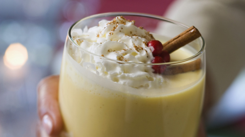 As Southern Living explains, the added alcohol of your choosing is a drink mixer, so there's no need to crack open your most expensive booze — unless you want to pull out all of the stops before the new year begins. Brandy is a common go-to, notes Southern Living, but darker rums and cognac can also get the job done. Bourbon can be added to recipes for an extra-boozy beverage, but be warned: Eggnog can easily be overpowered, and the more delicate flavors of the nog itself can be lost. Southern Living offers the guidance of using a 1-to-5 ratio, with 1 part booze to 5 parts nog, to help you keep the drink's elements in order.