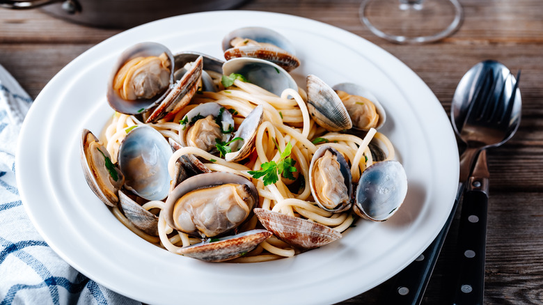 No doubt one of the reasons for linguine alle vongole's popularity is its star ingredient: the clams. Clams have long been a popular shellfish, sitting comfortably in the ranks with shrimp, oysters, mussels, and lobsters. So, it stands to reason that when making pasta in which your clams are the main focus, you'll want to bring out as much of that salty, oceanic flavor as possible. To achieve this, nearly all recipes for linguine alle vongole will have you using fresh clams, which are absolutely essential. After soaking fresh clams to get any sand out, you add them to the sauce, allowing the heat to open them up and release their glorious juices.