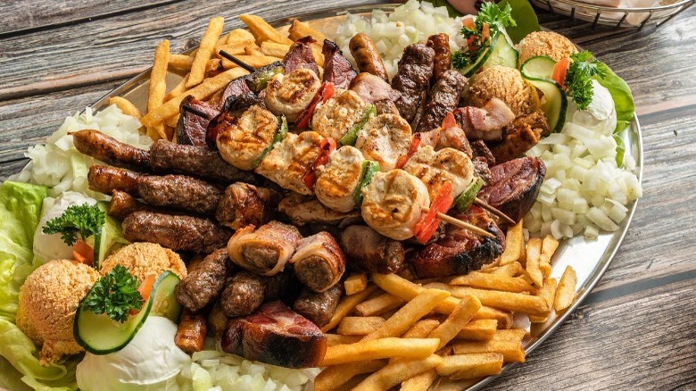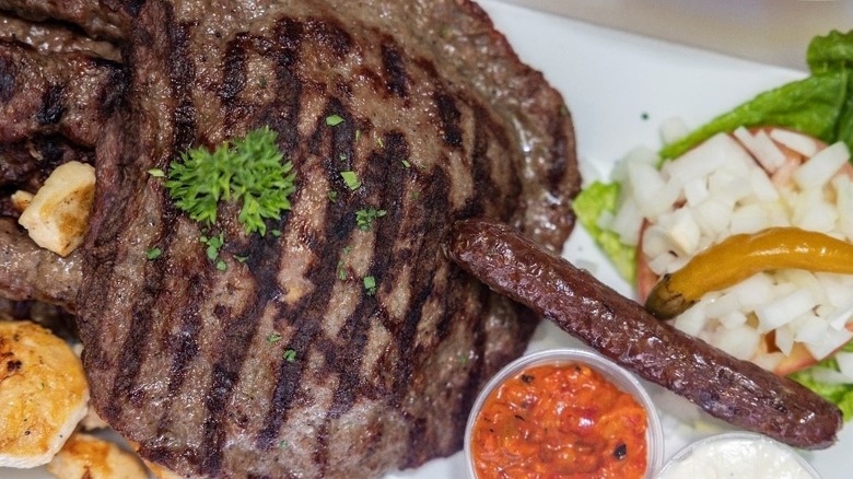 Among the Bosnian dishes that we haven't covered already are a thin-sliced version of chicken-fried steak called becka snicla and grah, which is a bean stew made with smoked beef. There's also telece pecenje, which is roast veal; begova corba, a beef and cabbage stew; and cufte u paradajz sosu, which consists of meatballs in a tomato cream sauce served atop egg noodles or mashed potatoes. For heartier appetites, however, Mersim's offers a multicultural mješano meso (mixed grill) that includes not only ćevapi, kebabs, and the aforementioned becka snicla, but also features steak, fried chicken wings and tenders, cheddar and broccoli-stuffed chicken, french fries, and onion rings.