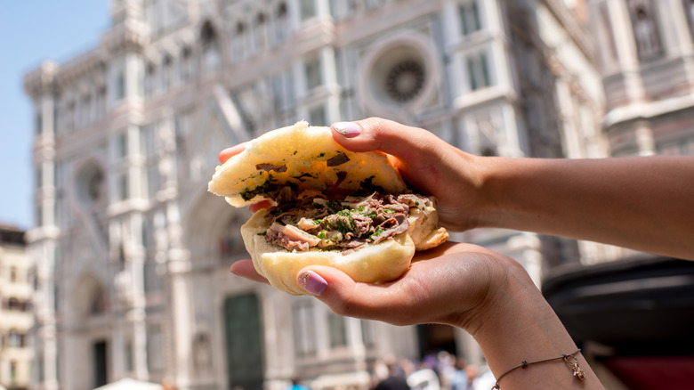 Florence is known for many of its street food dishes, but lampredotto might just be the most enviable. Their famous "chioschi" or street food stands, line the streets and dish out lampredotto, a traditional sandwich filled with an interesting cut of beef, says Visit Florence. Specifically, lampredotto is the "fourth and final stomach of a cow," according to the site, which is typically slow-cooked, sandwiched between crunchy bread, and paired with an array of vegetables and hot sauce.