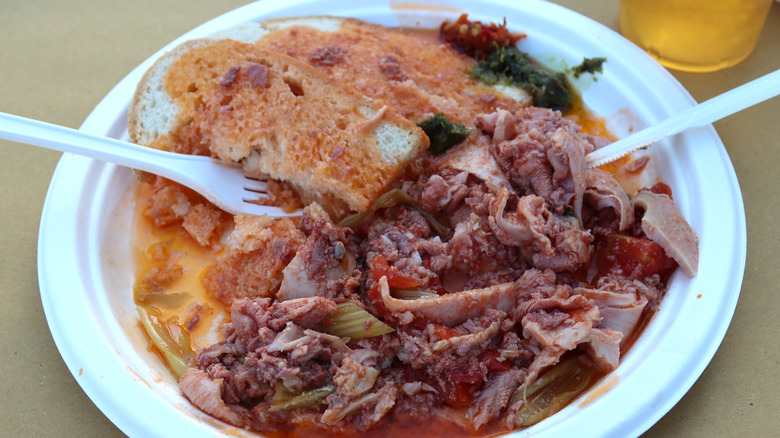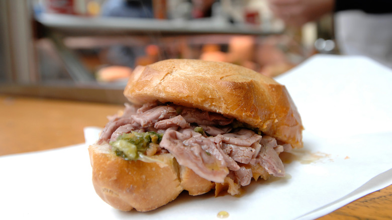 The tender meat is typically slow-cooked alongside vegetables to make a more complex flavor. "Tomato, onion, carrot, parsley and celery," as Visit Florence notes, are often added to the pot with meat and eventually slathered alongside it on a crusty sandwich bread, which is often free of salt, says Florence Inferno. The sauce it's served with is typically composed of parsley, garlic, and capers and is often paired with chili-infused olive oil.