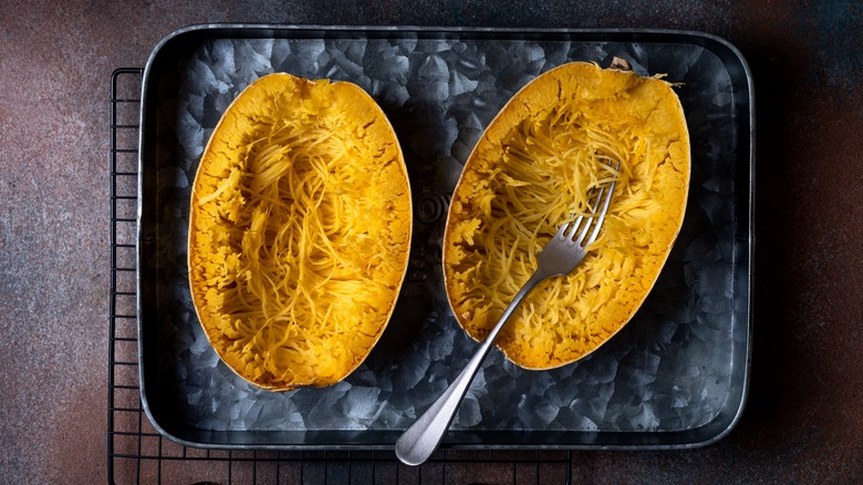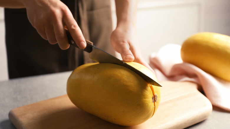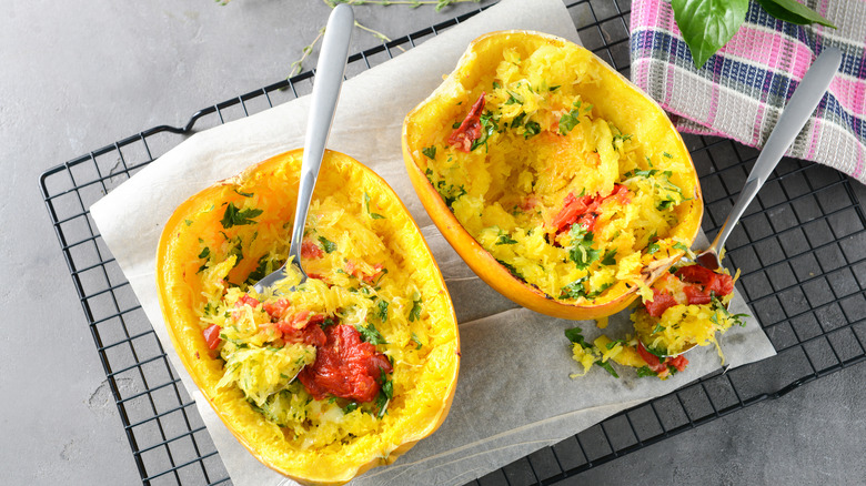 Beyond a classic sauteed chunk of squash or pan-roasting your gourd, there are a few more creative options to experiment with. Do you have a spaghetti squash that's lasted until summer? Fire up the grill and try charring lengthwise slabs of the squash. If you're worried about an open heat source or the time it might take to roast or bake your squash, you can try steaming or boiling the gourd to cook the flesh to perfection. If you're in a pinch, and spaghetti squash is the only thing that will sate your cravings, don't worry — microwaving your spaghetti squash is a perfectly reasonable cooking method. Just be sure to prick the rind or cut it in half. You wouldn't want an explosion in your microwave.