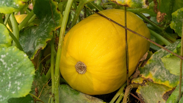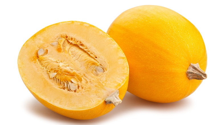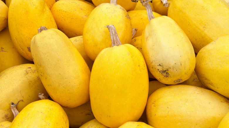 Produce purchased seasonally will always taste better. No matter what time you're buying squash, there are always ways to spot spoilage. According to a guide by Epic Gardening, any squash you pick needs to sound hollow when you thump it with your hand. They should also be uniformly yellow. Any green spots or pale areas can mean the squash hasn't fully ripened. The skin should be dull and matte and shouldn't scratch or break if you try to press your fingernail into it. Be sure to look out for any squash that has cracks in the skin or looks like it's split. Finally, if there is any visible damage, like bruises, mushy skin, or mold, your squash selection is likely overripe and spoiled.