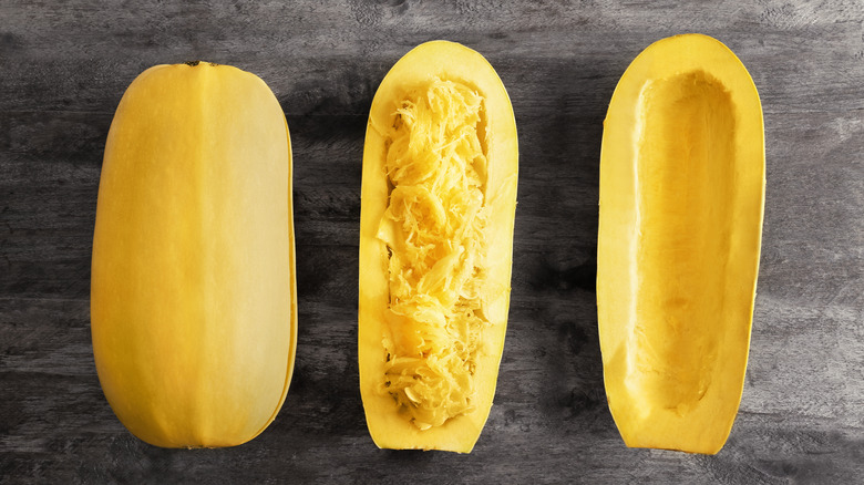 There are alternatives, of course — rice noodles, gluten-free pasta, and black bean pasta come to mind. If none of those strike your fancy, though, there's still the option of the culinary world's versatile hidden secret: spaghetti squash. This bright yellow winter squash isn't your average zucchini. Behind its hard outer shell is a slightly sweet interior that transforms when cooked. As heat breaks down the firm flesh, it becomes stringy and pulls apart into thin spaghetti-like strands which give this squash its name. Its sweet but otherwise unobtrusive flavor makes it the perfect carrier for sauces and toppings. You can use spaghetti squash as a pasta alternative, but don't let its name fool you. There's so much more that this humble gourd can offer if you keep in mind some troubleshooting tips.