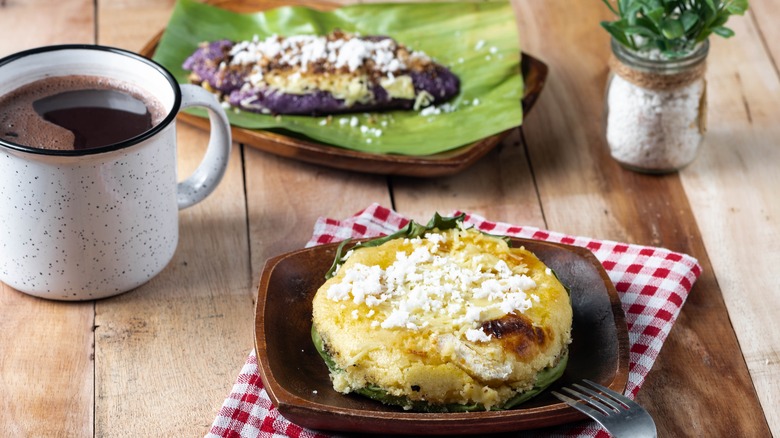 But the traditional sweets that find their way onto the Noche Buena table are more likely to be purchased from street vendors fresh outside church. After all, where else would you find mouthwatering slabs of bibingka — the rice cake traditionally cooked in a clay pot over hot coals then topped with a variety of flavors from salted egg and cheese to butter, and young coconut, per Asian Food Network. Then there is puto bumbong, the bright, purple rice cake steamed in bamboo tubes and eaten with brown sugar, butter, and coconut, per Tatler Asia. In her recollections of past Noche Buena celebrations, Filipino food writer Doreen Fernandez also talks about "suman" served with cups of thick, steaming hot chocolate, per Positively Filipino. The glutinous rice cake, which is steamed in banana leaves, per Kawaling Pinoy, and was mainly made at home during Fernandez's time, is also purchased outside.