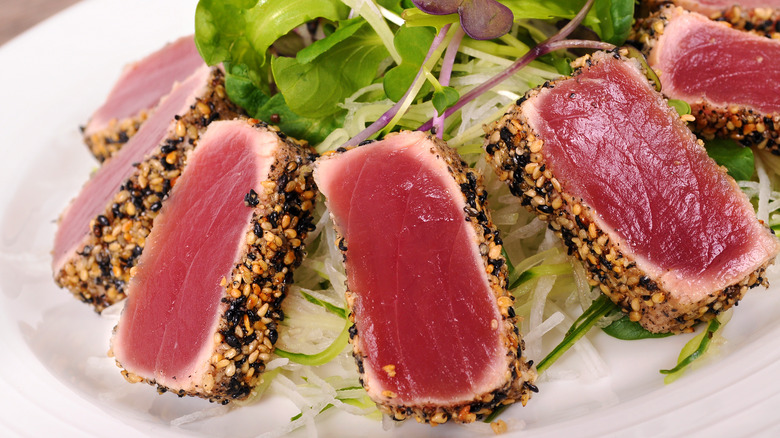 There are several ways to prepare both types of fish, such as broiling, grilling, and sautéing. Pan-searing is another popular method because it's quick and easy to accomplish, but before you start the cooking process, it's important to opt for tuna that is either sashimi-grade or sushi-grade. Most of the time, ahi tuna is either raw inside or cooked to a rare or medium-rare doneness, so low-quality tuna is not advisable for this recipe, per Food Network. On that note, it's also important not to cook ahi tuna too much because it may end up dry and void of any flavors.