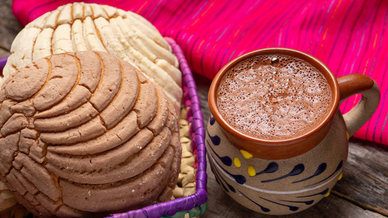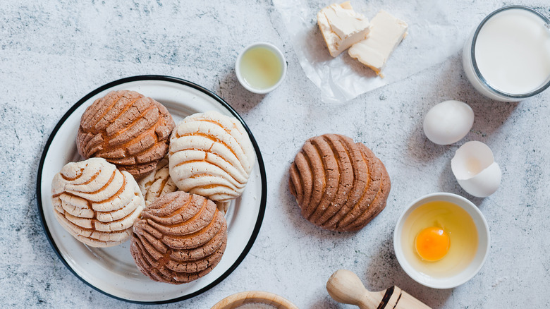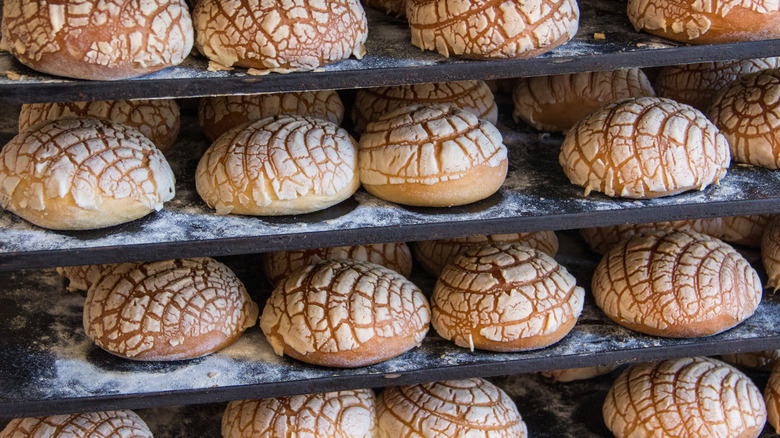 Conchas are classic Mexican pan dulces or sweet breads. The baked treat is known for its signature shell-like shape and pattern, per Serious Eats. Typically found in panderías both in Mexico and the United States, conchas (which means shells) are made of a pillowy enriched dough called biscocho, according to Thrillist.