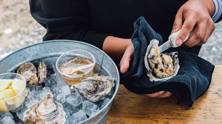 Their hard, jagged shell and slippery texture can be a mishap waiting to happen. One of the most common processes to crack open an oyster is by shucking. According to Food Network, shucking begins by placing the oyster inside a cloth with the "cupped shell" facing the bottom and the "flat shell" facing the top. You then hold the mollusk in place with the cloth before placing your oyster knife inside the opening of the oyster. And next, you twist the knife to pop it open. And once you get the oyster open, you have to carefully cut through the top and bottom of the shell.