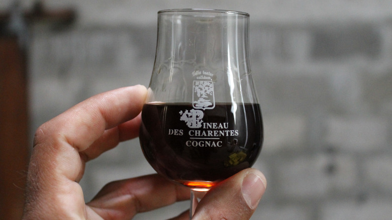 This fortified wine is traditionally made today by using three parts wine-must to every one part Cognac and must be aged for at least one year (via Punch Drink). Pineau des Charentes comes in as many colors as wine does: white, pink, and red, and can be made from several grape varietals so long as they are grown within France's designated region. Travel Distilled says that Pineau des Charentes tends to use Ugni Blanc, Folle Blanche, Colombard, Sémillon, or Sauvignon Blanc as its white wine base and Cabernet Franc, Cabernet Sauvignon, or Merlot grapes for its red wine base. No matter the wine, this drink will be on the sweeter side (though not as sweet as classic dessert wines) and averages around 17% alcohol by volume, and has some notes of spicy vanilla from the Cognac and barrel (via Food & Wine).