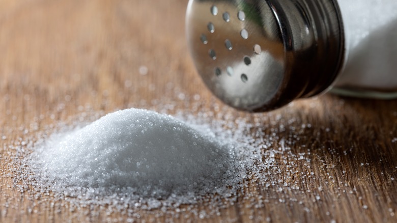 There's a good reason granulated salt is in your rugalach, and not your rib eye. According to MasterClass, table salt is refined by rinsing raw salt, purging it of its natural minerals, and then drying it in a controlled environment that produces small, uniform grains. Some granulated salt contains additives like iodine, which can impart a metallic flavor, and anti-caking agents that separate the fine grains. But this variety of salt proves useful in baked goods because the small granules will distribute more evenly than rougher salts, creating a more consistent chemical reaction.