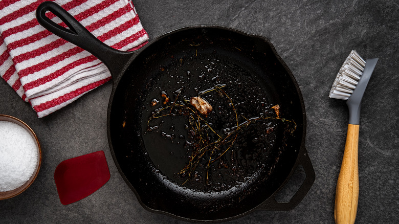 Another common misconception involves cleaning cast iron, with many partisans firmly stating that soap and scrubbing should never be applied to the black surface. While soap and a little elbow grease are fine in moderation (via America's Test Kitchen), other options help get a thorough clean while still protecting the polymerized interior.