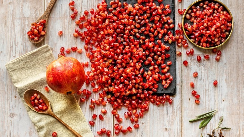 We've got one last trick for making the most of your wooden spoons — they're a pretty terrific tool for persuading those tricky arils out of juicy pomegranates, with no scraping required. We know that we'd eat loads more pomegranates if they were just a little easier to tackle. One common method includes submerging the fruit underwater and cracking it open, which is easy enough but uses more dishes, utensils, and water than necessary. Another option is to simply slice it open and start picking the bits out, but that can be messy and time-consuming, especially when you realize how easily the juice will stain everything it touches.