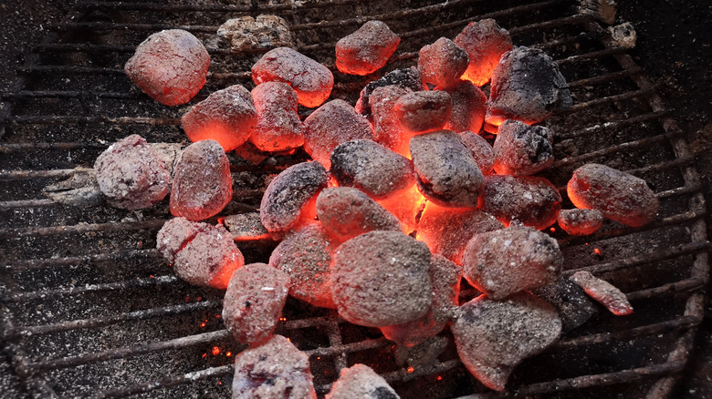 Yes, those little charcoal discs have a name: briquettes. Per Smoked BBQ Source, briquettes are made from sawdust and leftover wood with several additives mixed in. The briquettes burn longer than lump charcoal and maintain temperature for a longer period — which makes them ideal for grilling, or at least Wolfgang Puck thinks so. Puck recommends lighting charcoal briquettes at least an hour before you plan to grill any food over them. This means that you'll be grilling over hot coals rather than a direct flame. Grilling over a direct flame isn't always ideal because you may inadvertently singe your vegetables, fish, or steak.