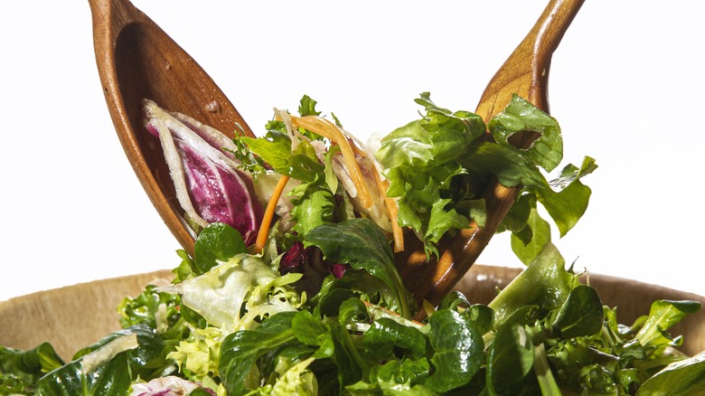 Making sure your salad has an even distribution of seasoning can be difficult — especially when your bowl is small. Wolfgang Puck has an unconventional tip to ease your salad woes, and it involves grabbing a sheet pan from your kitchen cabinet. The chef recommends seasoning salad on a sheet pan. Evenly layering greens on the pan before adding salt, pepper, and your favorite dressing allows the seasoning to seep into every crevasse of lettuce, arugula, or whatever salad base you choose. You can also use this trick with salad toppings since every cherry tomato and pepper deserves to be the star of the show.