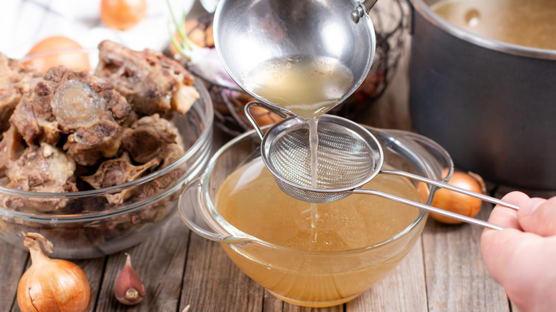 While the soup scum is not harmful to ingest (though you'll often hear them referred to as impurities), it's customary to remove it so that your broth doesn't turn an unappealing, grayish color. The best time to do so, according to Umami Days, is when the broth reaches boiling point. Using a slotted spoon or fine mesh strainer, remove any suds forming on the broth until the liquid is clear and no more foam is forming. This can take anywhere from 10 to 20 minutes, depending on how much protein is escaping. It also pays to strain the broth through two layers of cheesecloth once it's finished cooking to catch any residual matter. Your end result should be a beautiful, clear, and flavorful broth.