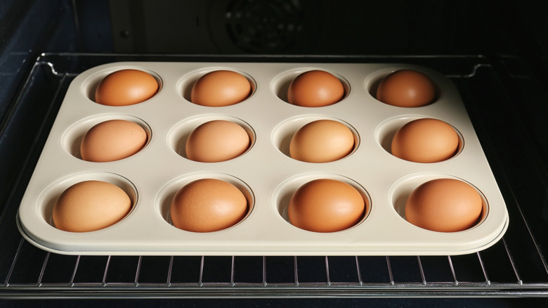 If you're hard-boiling your eggs, the process couldn't be easier. After spraying the muffin pan with oil and cracking an egg in each cup, Real Simple recommends baking them at 325 degrees Fahrenheit for half an hour. To make sure they don't continue cooking out of the oven, immediately place them in an ice bath. And if you enjoy making poached eggs, it's actually one of the absolute best uses for your muffin tin. Just add water over each egg and bake at 350 degrees Fahrenheit for nine to 15 minutes.