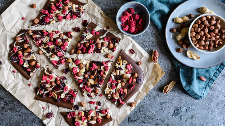 In addition to the joy of sharing chocolate bark with loved ones, it is also a great platform for experimentation. The classic topping is nuts, which is a crowd-pleaser. Torres says "I like the one with the nuts. I like classic flavors." But he also makes one with mint and pretzels and endorses putting dried fruit of all kinds into chocolate bark. "If you use raisins — if you use dry apricots, dry mango, dry peaches — that brings some sweetness to it, but also extra flavor, which is always good." Just remember to be mindful of how sweet and/or sour the fruit is and to cut it into small pieces if it's something large like an apricot.