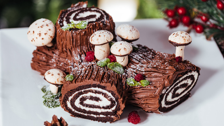 If you'd like to mix it up, you can forego the chocolate cake and make a white bûche de Noël (which is Yule log in French). This version uses white sponge cake, white chocolate ganache, and cute mushroom-shaped chocolate cookies.