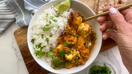 "My favorite thing about this recipe is how flavorful the creamy tomato gravy is [when] paired with the marinated vegetables and roasted paneer that is toasted on the outside, and soft in the middle." Hahn shares. "It also tastes even better the next day as the flavors continue to meld, making this a great meal prep recipe." Hahn says. Once sealed up in a glass container, it will last all week in the fridge, which is a win for busy families everywhere.