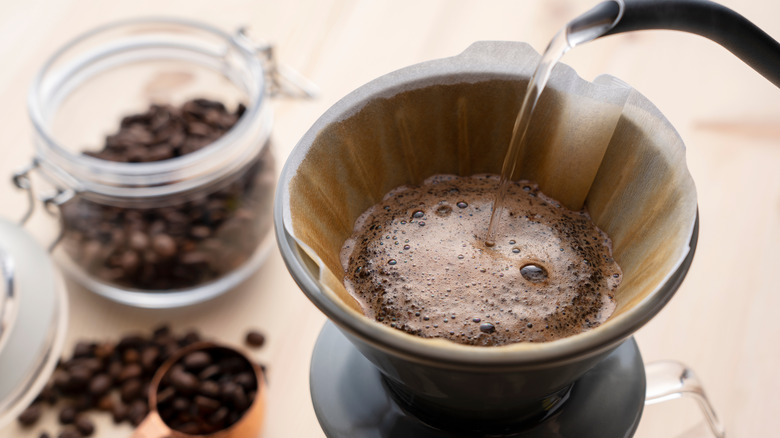 With pour-over coffee, you can control water temperature, spread, and speed, the first of which will affect how the beans brew, which will then affect the resulting taste, per Taste of Home. As for the spread, automatic drip machines release water onto coffee grounds from several small spigots. When pouring water pour-over style, you can soak beans more thoroughly with one strong stream (Blue Bottle recommends the spiral method of pouring to cover all grounds equally). Taste can also be impacted by the speed at which you brew. The first pour of water in pour-over coffee allows the coffee grounds to "bloom," or release their aromatic gasses and begin the brewing process. You can then decide how much time to wait before adding more water during the next pour.
