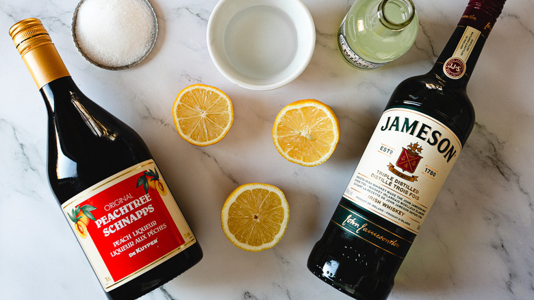 - Add the Irish whiskey, peach schnapps, and homemade sour mix to a shaker with ice. Shake for at least 30 seconds, until chilled.