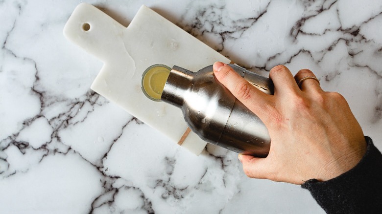 Start by juicing 1 lemon. You can do this by hand, or with an electric citrus juicer. Combine the lemon juice, sugar, and water in a jar with a top. Shake until the sugar is fully dissolved, and set aside.