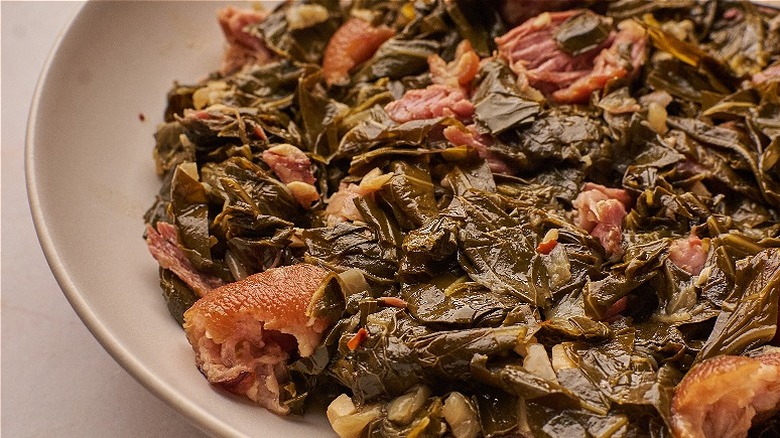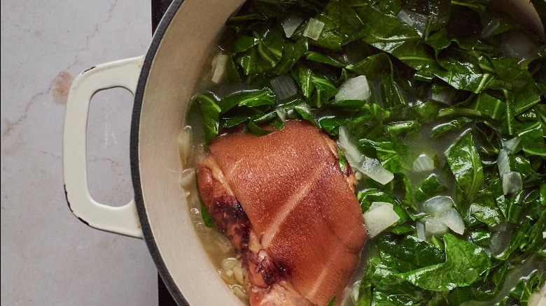According to developer Michelle McGlinn's recipe below, the secret to great Southern collard greens is proper washing, perfect seasoning, and simmering low and slow with smoked meats. In this recipe, we opt for hickory smoked ham hocks, which are easy to find in the cured meat section of most grocery stores. The ham hocks are braised in what becomes a delicious potlikker, and falls apart into tender pieces in around 2 hours. Don't be intimidated by the cook time — it cooks low and slow, making this recipe nearly foolproof. Even if you're not a Southern cook, you'll feel like one with this easy recipe in hand.