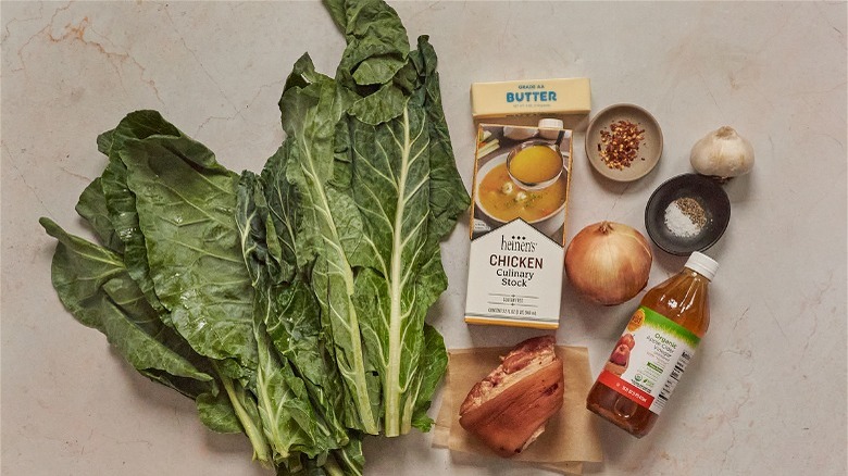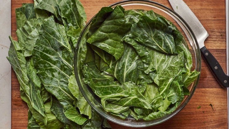 Of course, you'll need fresh, leafy collard greens for this recipe. You can find these in most grocery stores near the lettuce, and they'll look like really large pieces of spinach. Grab a few bunches — you'll want about 2 pounds of greens to work with. Similar to spinach, the greens will cook down, so be sure to start with more than you think you'll need.