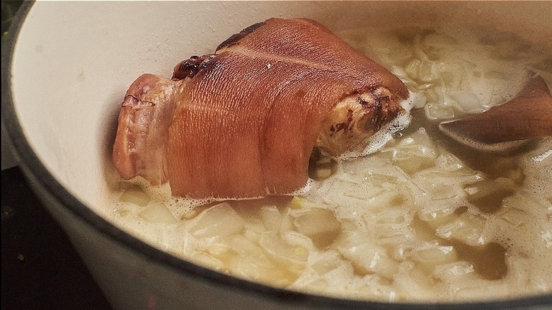 - Melt the butter in a large pot or Dutch oven over medium heat. Once melted, sautée the onions and garlic until softened, about 5 minutes. Add the ham hock, and sear until fragrant, about 2 minutes, then add the chicken stock. Bring to a simmer.