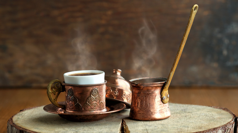 Because the fine coffee grounds are brewed directly in the water and not filtered, some make their way into your cup, making a tangibly thicker and stronger coffee that isn't for everyone (via Coffee-Direct). Coffee is not a one-size-fits-all drink, and the coffee brewers in Turkey are well aware that some of their customers need a sweet kick to make it palatable. But unlike in U.S. diners, where coffee drinkers are handed a pre-made cup of Joe and expected to add their sugar after brewing, in Turkey, the sugar is added to the grounds during the brew.
