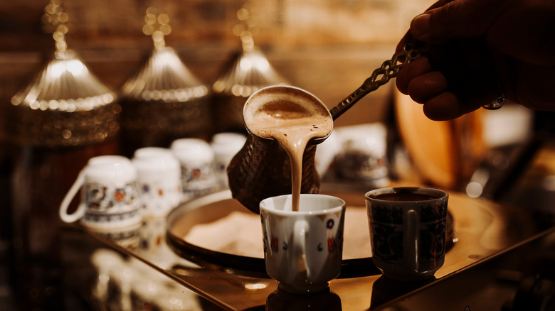 But what exactly makes Turkish coffee so special besides its historical and cultural significance? According to Death Wish Coffee, authentic Turkish coffee is made in a particular way using sand. Yep, you read that right — sand is heated over a fire, and the cezve is filled with water and coffee and boiled atop the sand. The sand allows the heat to be conducted evenly, and the coffee becomes foamy as the grounds quickly infuse the water, and the deeper the pot is, the more heat it receives. But because of how Turkish coffee is made, it can be pretty intense for some drinkers, so sugar is added upon request, though not necessarily when you think it would be.