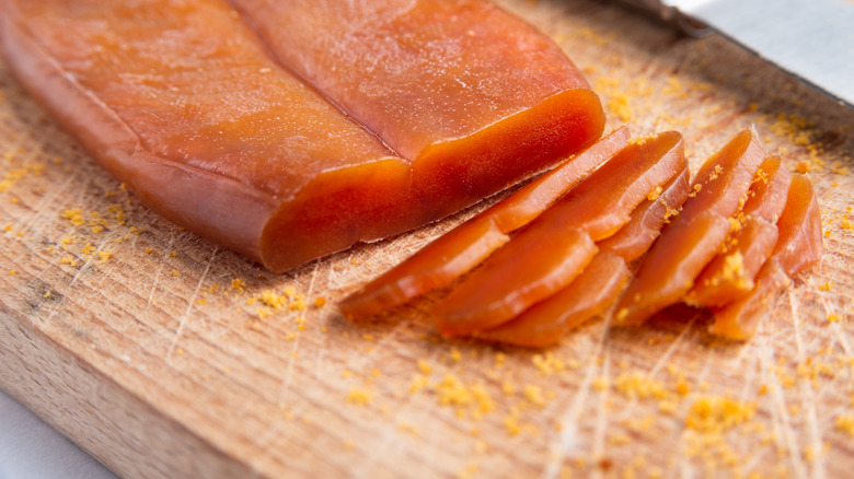 This amber-colored bottarga is also known as "Sardinian caviar," and it is usually shaved over pasta. But The Guardian points out that the amber-colored treat can also be sliced thin and served with a touch of olive oil as a snack.
