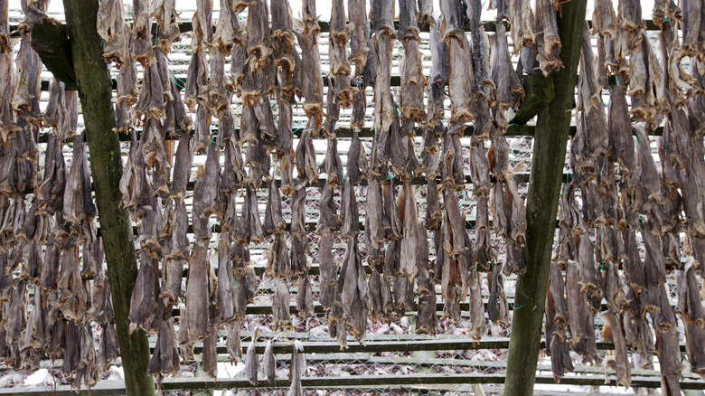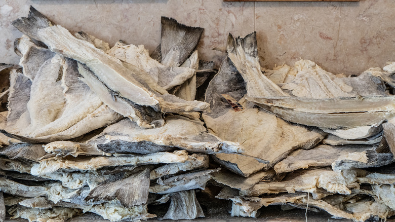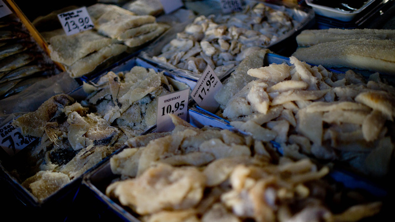 Buying bacalhau can be the trickiest part of the fish-consuming process. Opt for dried fish sold whole, cut up by the fishmonger, rather than pre-sliced. The various cuts of the fillet are delineated by name. From the prized, thick Lombos cut located in the interior to the small crumbly bits called Migas, make sure to verify which section is necessary for the application. Don't forget to check the appearance, too. The fish should be yellowish in color throughout, without any blood or black markings, reports Portugalist. Never go for a bacalhau that wasn't properly dried. The fish should be firm to the touch and stand up to a dehydration test. Hold the cod by the tail — no folds in the body should occur. Otherwise, it means the moisture content is not suitable for consumption, notes Lugrade.