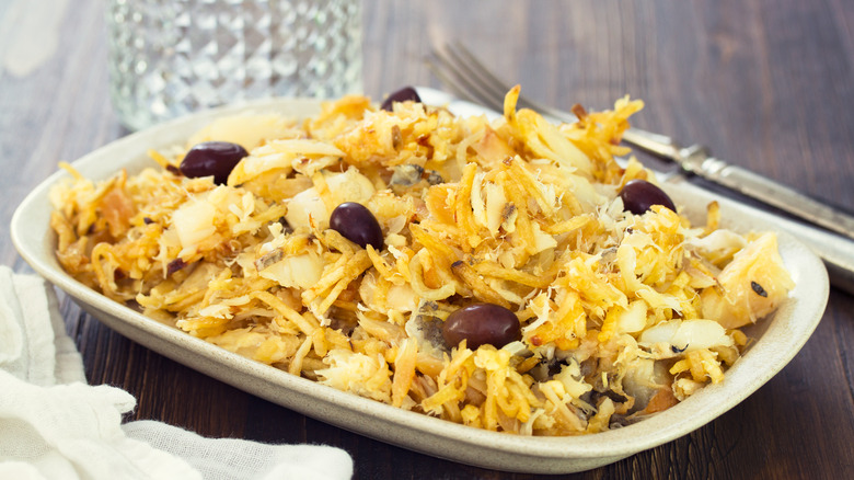 Any bacalhau preparation starts with rehydrating the fish, which is best done in advance. Take Food and Wine's recipe for Bacalhau à Gomes de Sá, a popular casserole-like dish with potatoes, olives, eggs, and seasoning. The fish is hydrated for 16-48 hours in a refrigerated bowl of water in the fridge. The water is changed out twice during the process. Afterward, the fish is boiled for 10-20 minutes before being mixed with other ingredients in the oven.