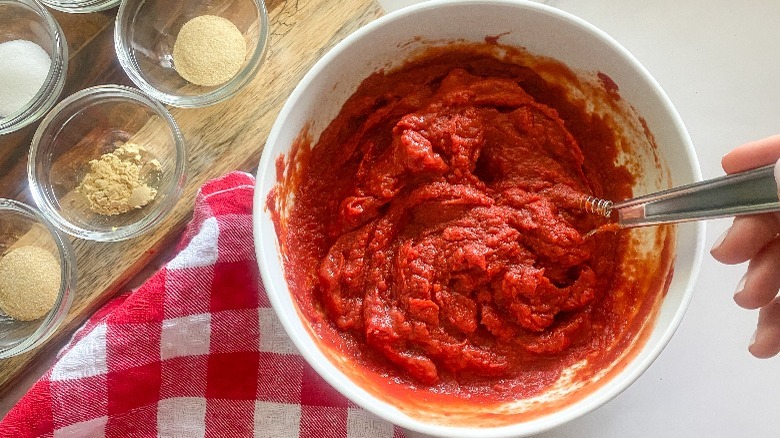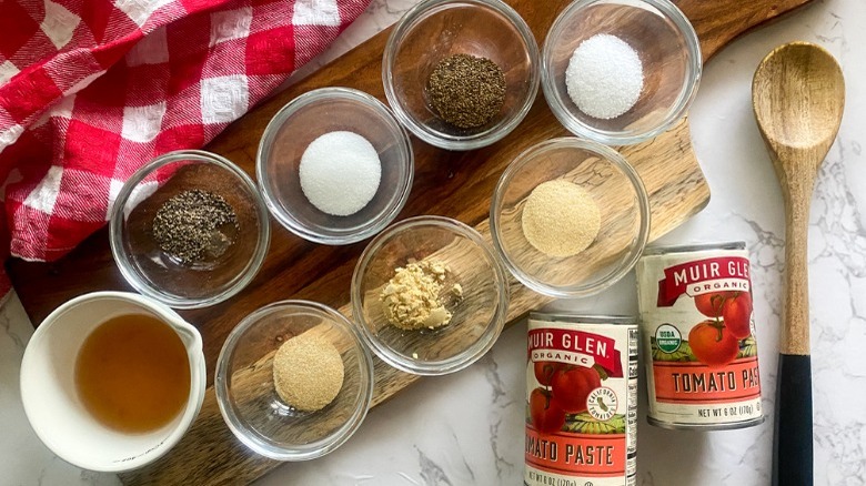 The base of this recipe is tomato paste. "Since tomatoes are consistently on the dirty dozen list, I always buy organic tomato paste, which is easy to find at most grocery stores," Hahn shares. Then, you will need some vinegar for the tangy element. You can use apple cider vinegar, which gives you the added fermentation benefits, or white vinegar. Then you'll need some pantry basics: sugar, celery seed, garlic powder, mustard powder, onion powder, salt, and pepper. Hahn mentions if you have celery salt instead of celery seed, you can use that, and omit the added salt.