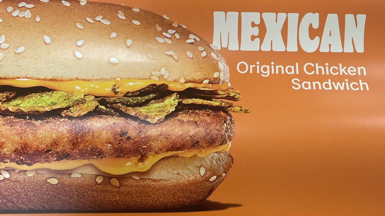 Over the decades, BK has launched various styles of chicken sandwiches, from the hand-breaded Ch'King to a line of Royal Crispy Chicken Sandwiches (via ChewBoom). But the Original is the one that has stuck around the longest, and early next year, according to The Fast Food Post, a new, picante (that's Spanish for spicy) version will debut — the Mexican Original Chicken Sandwich. Featuring the same breaded, fried chicken as the Original, the new sando will also include ghost pepper cheese and crispy-fried jalapeños — essentially a chicken version of BK's Halloween release, the Ghost Pepper Whopper. The chain tells The Fast Food Post that the sandwich will hit stores in early January and that it will cost around $5.99.