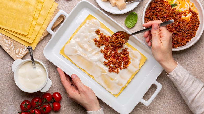 Béchamel, which is also known as "white sauce," starts with the lightest color of roux and combines it with milk, according to Culinary Ambition. How much milk is needed depends upon how thick a béchamel is desired, and that can range from almost milky to something along the lines of homemade mayonnaise. Thinner béchamel can be used to coat meat or vegetables before breading. Thicker béchamel can be used to enrich lasagna, as shown above, or mac and cheese. It's also the foundation for the Mornay sauce that makes spinach Florentine so creamy and cheesy.