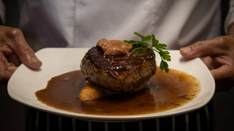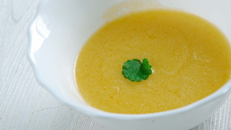 It also happens to be the least forgiving of all the mother sauces because it comprises an emulsion. And an emulsion, itself, is a bit of a paradox in that it's a mixture of two liquids whose molecules are not capable of combining in the first place — except in the presence of agitation (via Britannica). Think oil and water or oil and vinegar. In hollandaise, the liquids are egg yolk and melted butter.