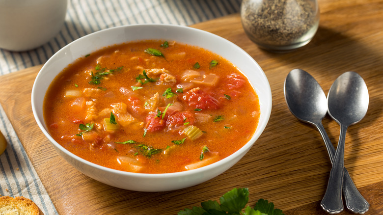 Celebrity chef Emeril Lagasse says diced carrot, bell pepper, crushed red pepper flakes, parsley, and oregano all belong in the recipe, per Food Network. Notably, tomato juice and chicken stock provide the liquid components for Manhattan chowder; there's no heavy cream to be found here. It makes for a thinner mouthfeel and a slightly spicy bite, while the acidic tomatoes and salty clams make for a complementary, dimensional flavor profile.
