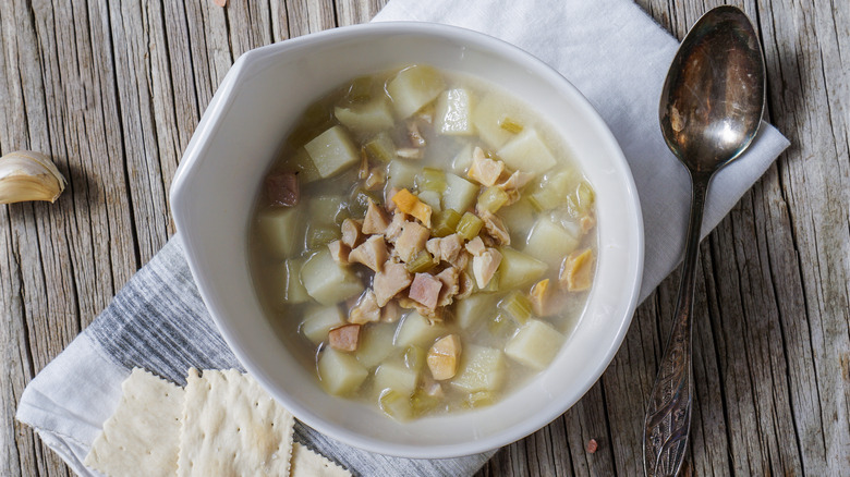 New England clam chowder is perhaps the most popular and well-known iteration of the dish. It's a classic combination of clams, onions, corn, celery, bacon or salt pork, and potatoes. Chef Ryan Hardy of The Coach House on Martha's Vineyard is one of the dish's biggest fans. It's an enduring local favorite that even New England transplants like Hardy himself celebrate unabashedly, per the James Beard Foundation. The chef says he has a bowl pretty much every day.