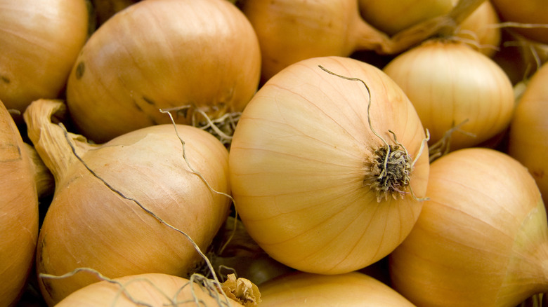 When preparing French onion soup, every chef has their favorite way of doing it, though the general recipe calls for caramelized onions to be simmered in beef stock and topped with bread and melty Gruyere cheese. Vidalias are an excellent onion choice for the dish, as Food52 explains they naturally provide a subtle sweetness that yields a shorter cook time than classic yellow onions, which require a longer, gentler heat to release their natural sugars properly. And though the amount of onion required for making this soup might surprise you, you should think twice before changing the recipe.