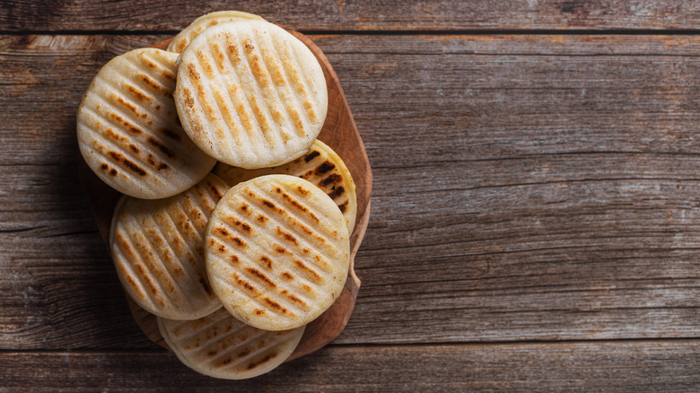 Arepas are found in many Central and South American countries, including Venezuela and Columbia. Arepas can be made with precooked corn flour (often sold under the P.A.N. label in the United States), water, and salt. Unlike tortillas, which are very thinly pressed, arepas are formed by hand and are about a ½-inch thick. They also have a smaller diameter of around three to four inches. Arepas can be stuffed with eggs, cheese, or beef or served as a side dish with toppings like salsa, guacamole, or pico de gallo.