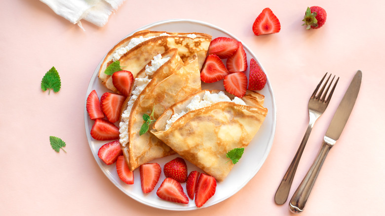 There might not be a more romantic flatbread than a crepe. These thin French pancakes are technically classified as flatbread but often include eggs, milk, and either butter or oil. According to the Original Pancake House, crepes were brought to fruition by a 13th-century French housewife who splashed porridge onto a hot skillet. The name came from the Old French word "crespe," meaning "curled," a reference to the sides of the crepe that curl over when the batter is spread over the hot surface.