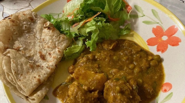 Roti and chapati are Indian flatbreads that are similar in cooking texture and method and so are used interchangeably in the culinary vernacular. Eat Your World notes that naan, which is cooked in a tandoori, is not the same as a roti or a chapati. Roti and chapati are rolled out much thinner than naan and are cooked on a flat griddle called a tawa. Roti can come in several different types, including the fluffy tandoori roti, extra thin roomali roti, and chickpea-based missi roti seasoned with cumin, turmeric, and red chili powder.