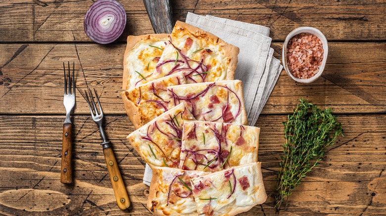 Flammkuchen is a German flatbread that is often treated like a base for pizza. This flatbread originated in the Alsace region of France, which straddles the German border (via Culture Trip). It was first believed that Germans who made the flatbread were focused on making food that could feed the working population in the area. One day, a baker schmeared a thin piece of dough with crème fraîche, sliced onions, and bacon, then baked it in a wood-fired oven. And thus, the flammkuchen was born.